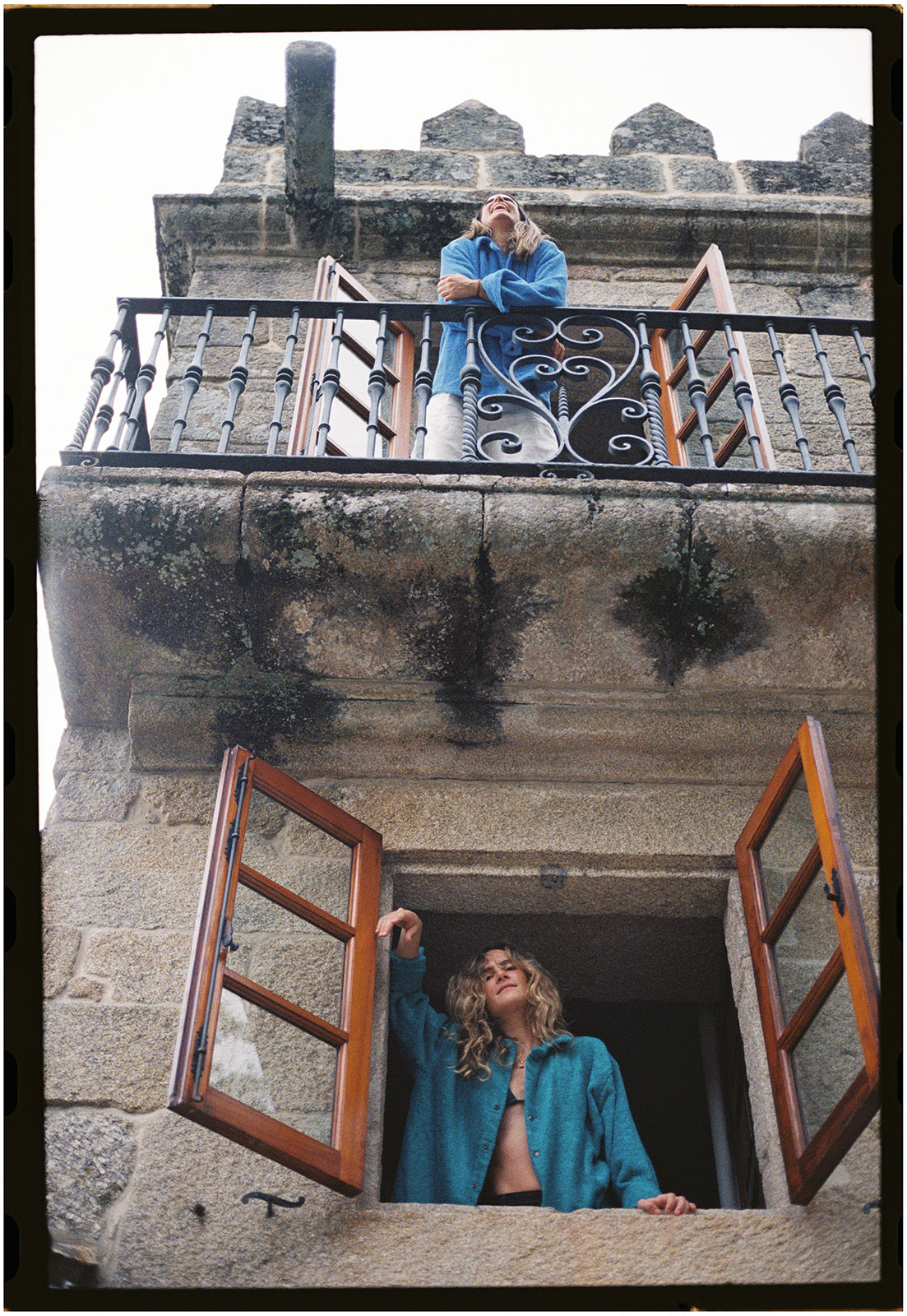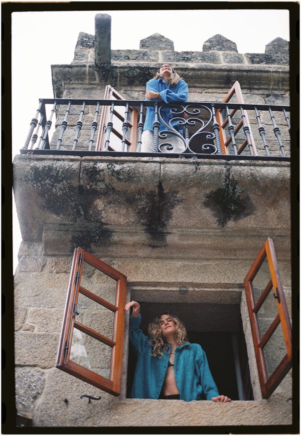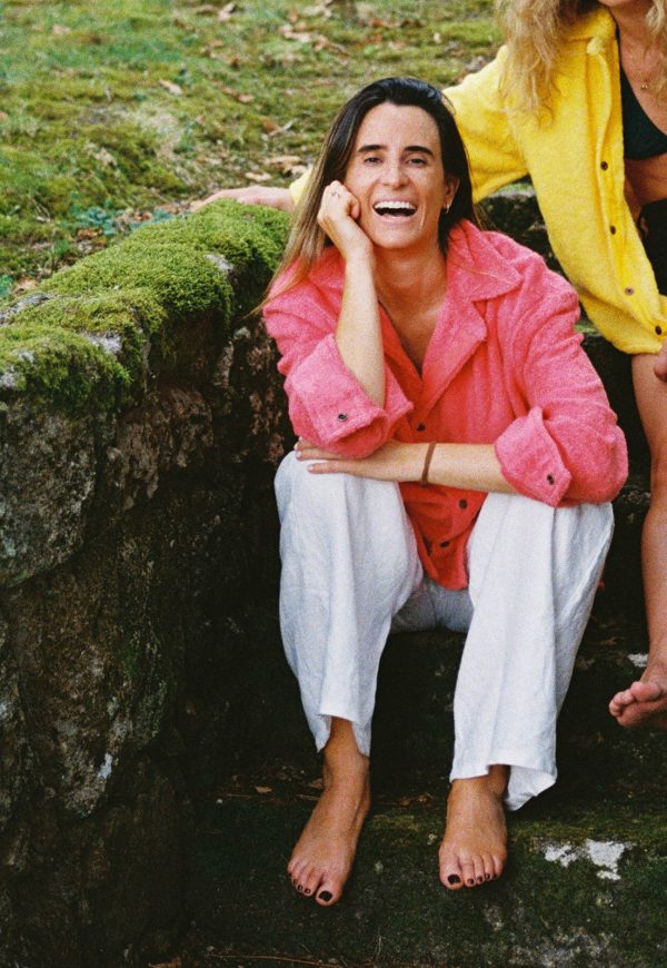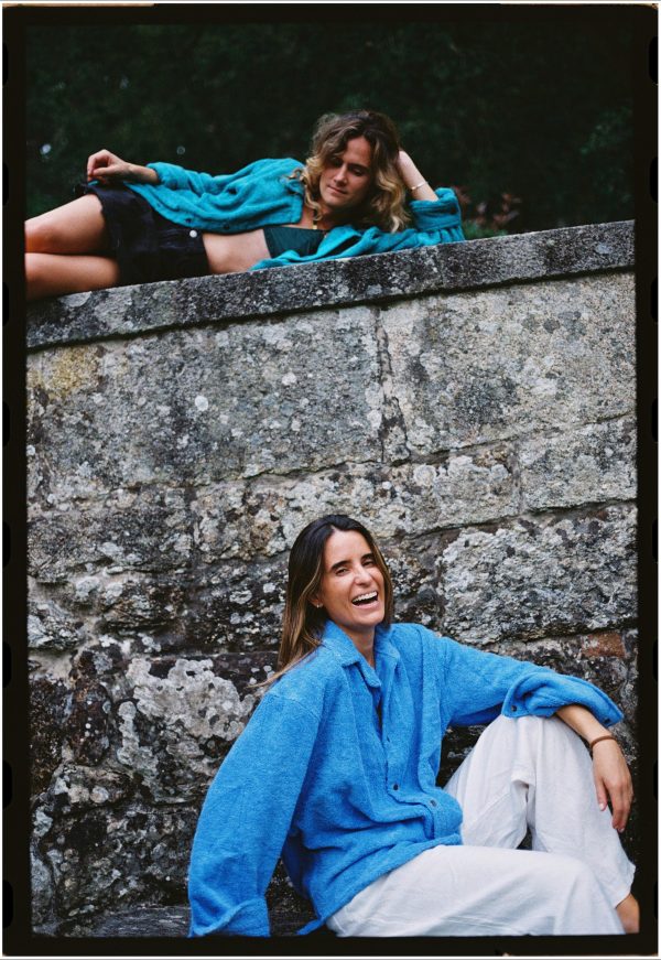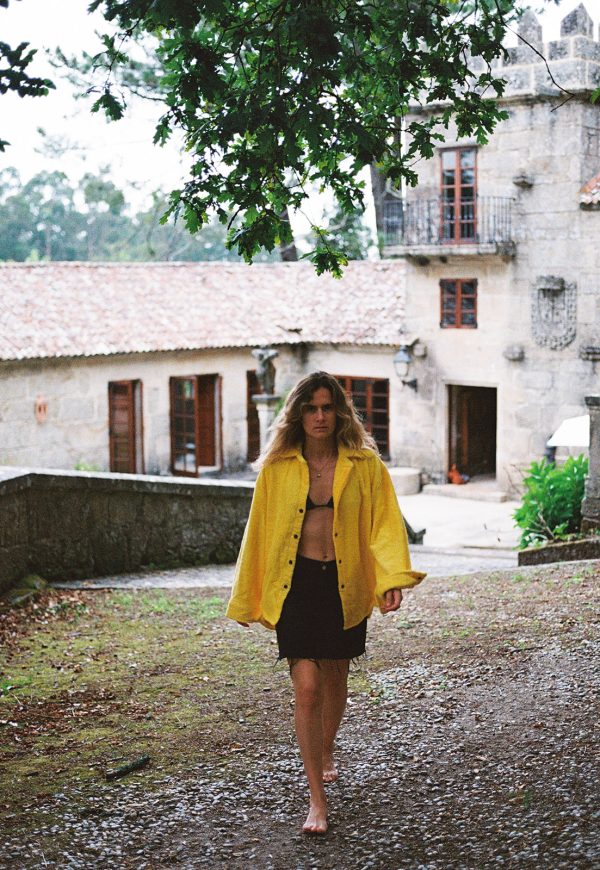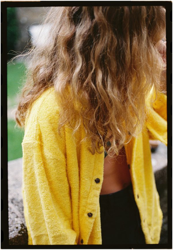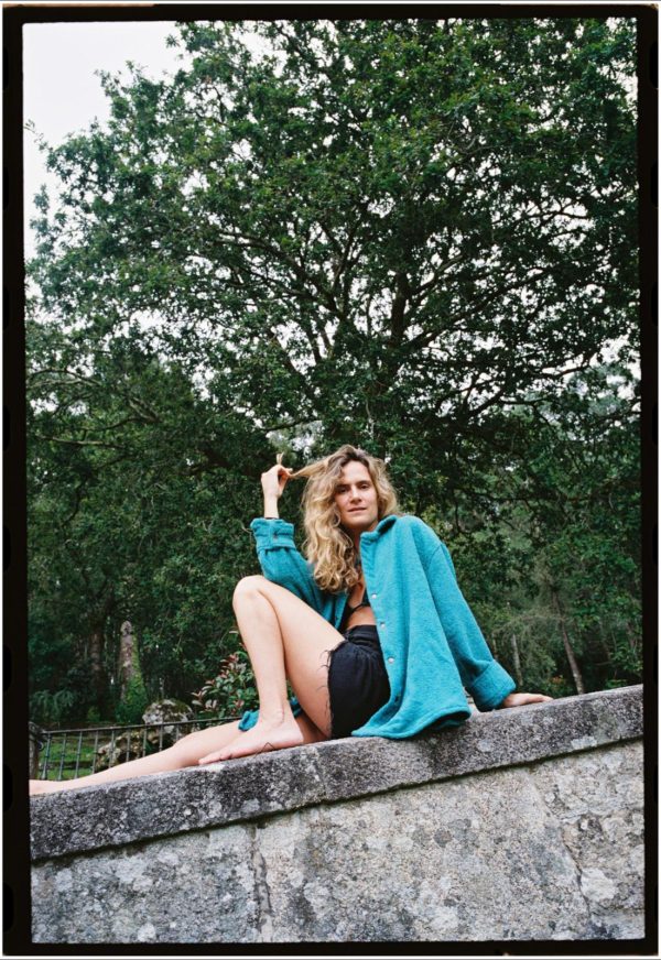 Camisa de felpa con botones metalicos color cobre en la solapa y en los puños.