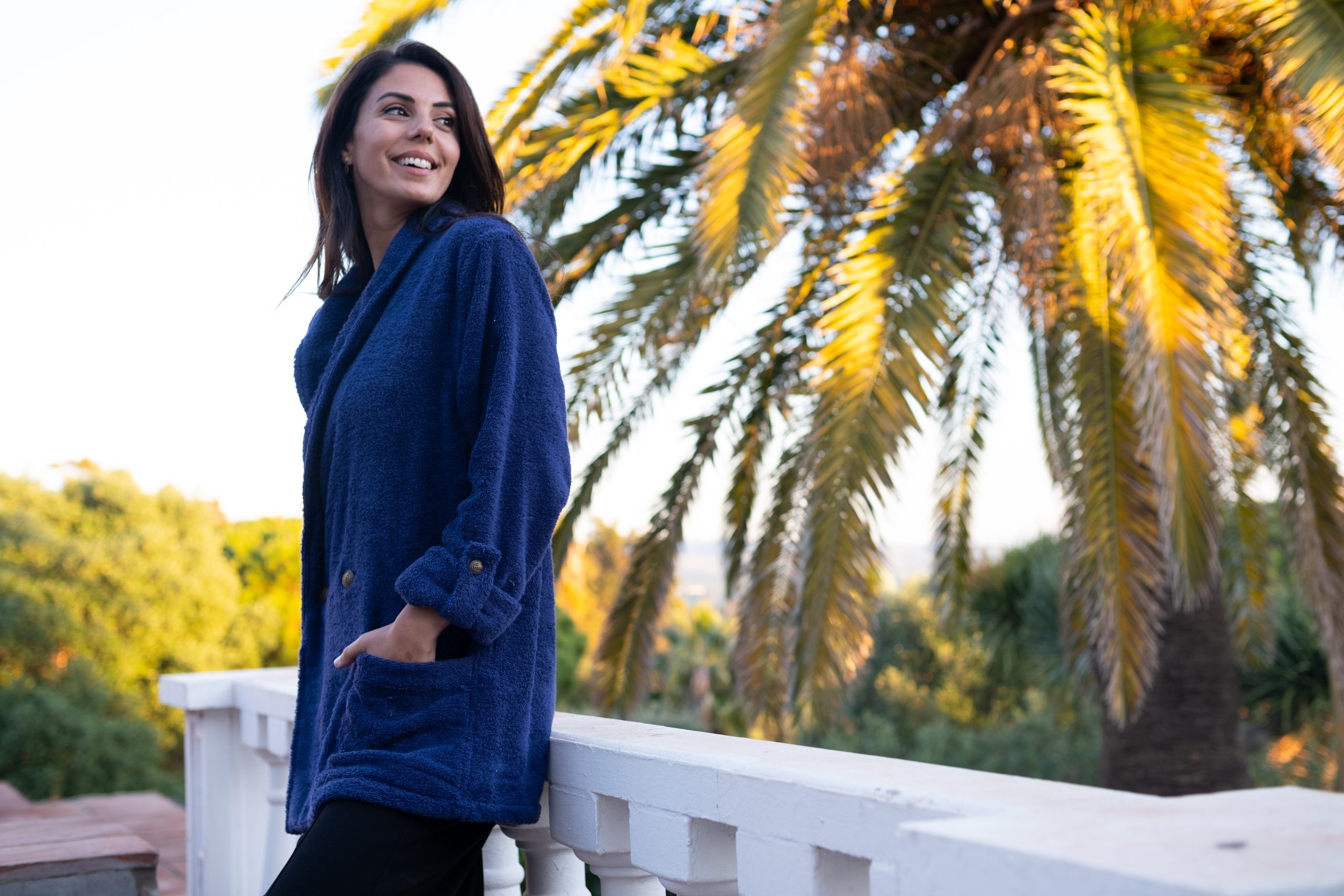 Este nuevo modelo es nuestra nueva creación, una chaqueta de rizo americano 100% algodón de color azul marino, con cuello de smoking y mangas dobladas recogidas con un botón. Cruza delante con dos botones de estilo marinero de color dorado envejecido con un ancla y en las mangas un botón del mismo tono más pequeño. Es un modelo tanto para hombre como para mujer.